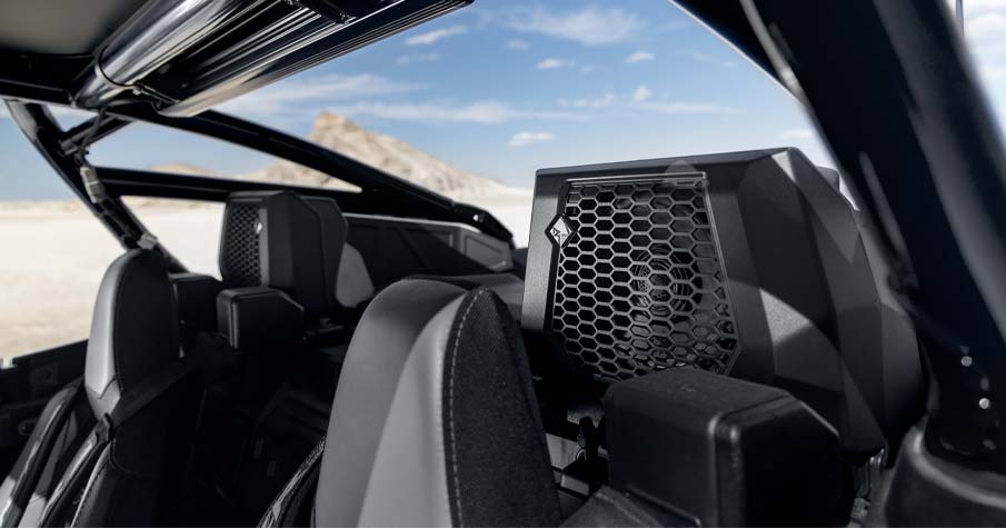 Factory-tuned and integrated Rockford Fosgate Stage 4 audio system with RIDE COMMAND source unit. Includes (1) 1500-W 8-channel digital amplifier, (2) 100-W 1" tweeters, (2) 100-W 6.5" component front speakers, (2) 100-W 6.5" coaxial rear speakers, and (1) 10" subwoofer. *Audio System is IPX7 and IPX9K water immersion tested to withstand the wet elements.